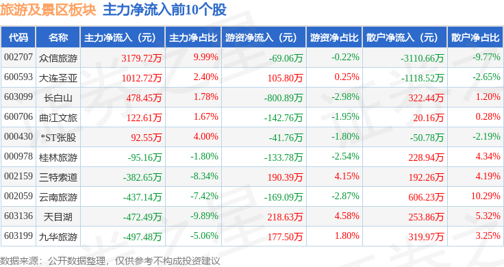 从资金流向上来看,当日旅游及景区板块主力资金净流出1.93亿元,游资资金净流出169.22万元,散户资金净流入1.95亿元。旅游及景区板块个股资金流向见下表: