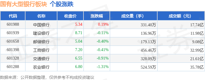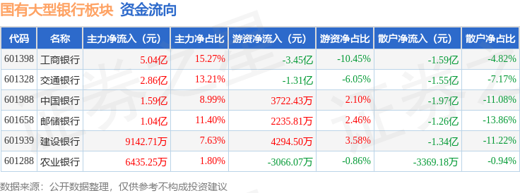 从资金流向上来看,当日国有大型银行板块主力资金净流入12.08亿元,游资资金净流出4.04亿元,散户资金净流出8.04亿元。国有大型银行板块个股资金流向见下表: