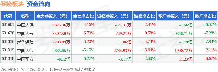 从资金流向上来看,当日保险板块主力资金净流出6.02亿元,游资资金净流出1.12亿元,散户资金净流入7.14亿元。保险板块个股资金流向见下表: