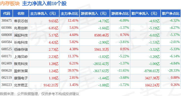 从资金流向上来看,当日内存板块主力资金净流入9.88亿元,游资资金净流出4.19亿元,散户资金净流出5.68亿元。内存板块个股资金流向见下表: