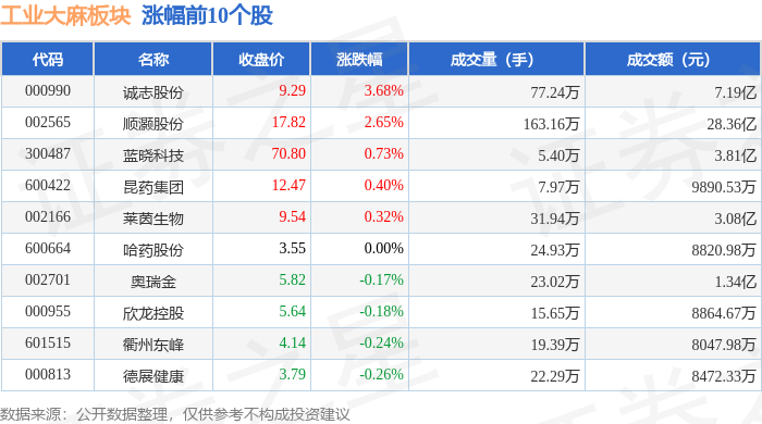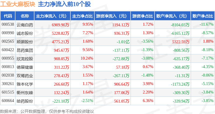 从资金流向上来看,当日工业大麻板块主力资金净流出1.44亿元,游资资金净流入1631.06万元,散户资金净流入1.27亿元。工业大麻板块个股资金流向见下表: