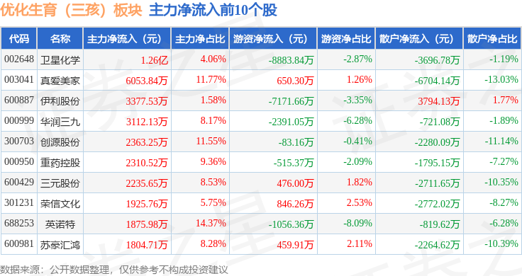 从资金流向上来看,当日优化生育(三孩)板块主力资金净流出13.61亿元,游资资金净流出1223.02万元,散户资金净流入13.73亿元。优化生育(三孩)板块个股资金流向见下表: