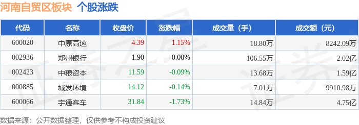 证券之星消息,1月28日河南自贸区板块较上一交易日下跌0.89%,宇通客车领跌。当日上证指数报收于4151.24,上涨0.27%。深证成指报收于14342.9,上涨0.09%。河南自贸区板块个股涨跌见下表: