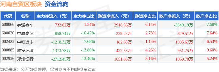 从资金流向上来看,当日河南自贸区板块主力资金净流出5430.47万元,游资资金净流入5402.44万元,散户资金净流入28.03万元。河南自贸区板块个股资金流向见下表: