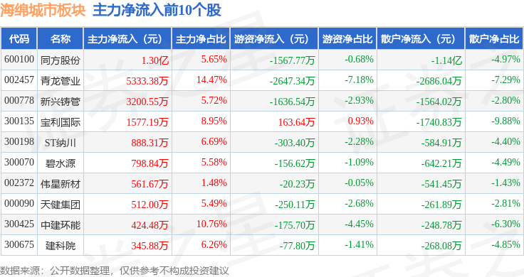 从资金流向上来看,当日海绵城市板块主力资金净流出1239.53万元,游资资金净流出2350.87万元,散户资金净流入3590.4万元。海绵城市板块个股资金流向见下表: