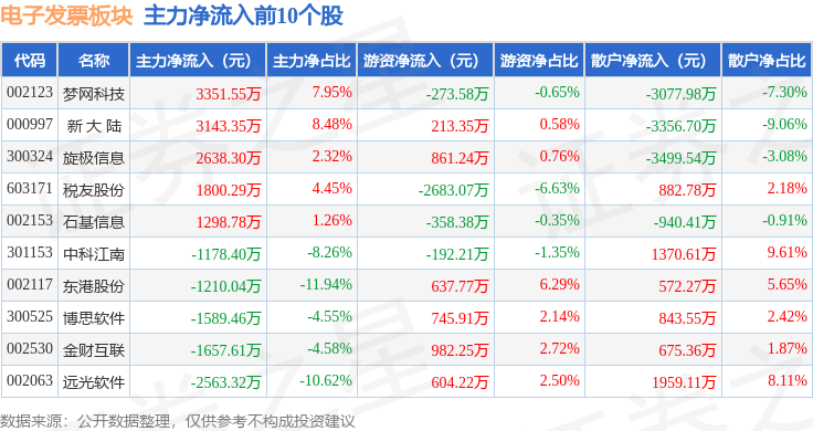从资金流向上来看,当日电子发票板块主力资金净流出5.81亿元,游资资金净流入1.19亿元,散户资金净流入4.62亿元。电子发票板块个股资金流向见下表: