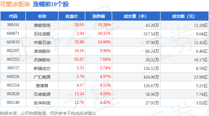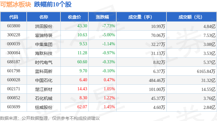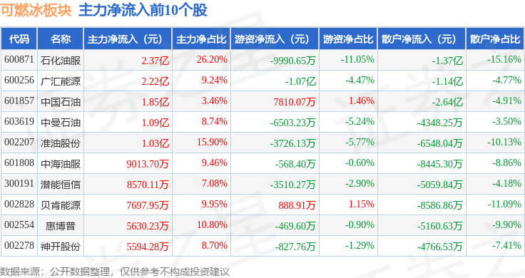 从资金流向上来看,当日可燃冰板块主力资金净流入8.6亿元,游资资金净流入1.53亿元,散户资金净流出10.14亿元。可燃冰板块个股资金流向见下表: