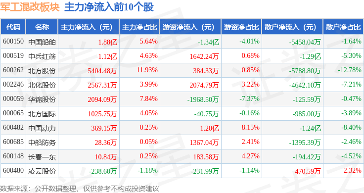 从资金流向上来看,当日军工混改板块主力资金净流出5.94亿元,游资资金净流入2.84亿元,散户资金净流入3.09亿元。军工混改板块个股资金流向见下表: