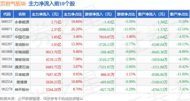 从资金流向上来看,当日页岩气板块主力资金净流入8.79亿元,游资资金净流入1.4亿元,散户资金净流出10.19亿元。页岩气板块个股资金流向见下表: