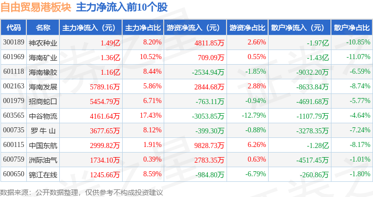 从资金流向上来看,当日自由贸易港板块主力资金净流出8.08亿元,游资资金净流入9.17亿元,散户资金净流出1.09亿元。自由贸易港板块个股资金流向见下表: