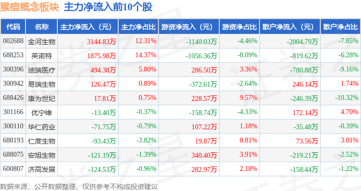 从资金流向上来看,当日猴痘概念板块主力资金净流出14.47亿元,游资资金净流入2.12亿元,散户资金净流入12.35亿元。猴痘概念板块个股资金流向见下表: