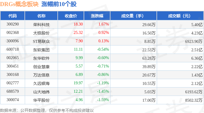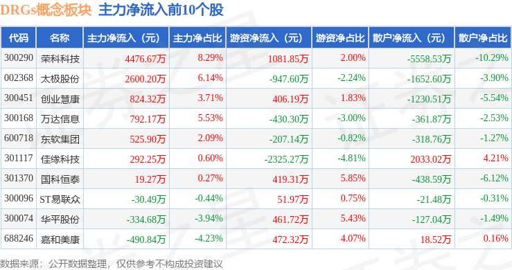 从资金流向上来看,当日DRGs概念板块主力资金净流出2.14亿元,游资资金净流入1906.22万元,散户资金净流入1.95亿元。DRGs概念板块个股资金流向见下表: