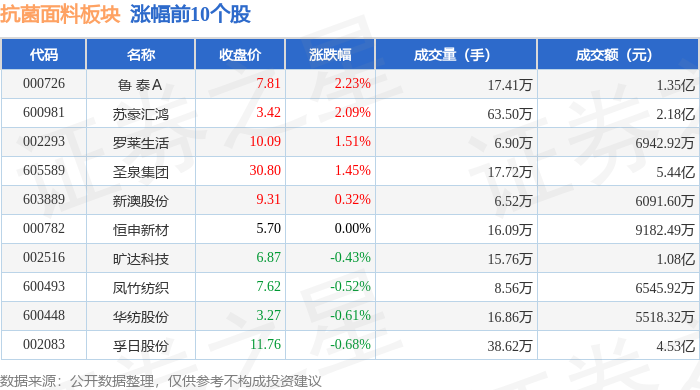 证券之星消息,1月28日抗菌面料板块较上一交易日下跌0.4%,众望布艺领跌。当日上证指数报收于4151.24,上涨0.27%。深证成指报收于14342.9,上涨0.09%。抗菌面料板块个股涨跌见下表: