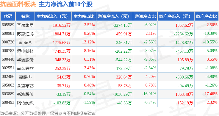 从资金流向上来看,当日抗菌面料板块主力资金净流出1.36亿元,游资资金净流出7401.41万元,散户资金净流入2.1亿元。抗菌面料板块个股资金流向见下表: