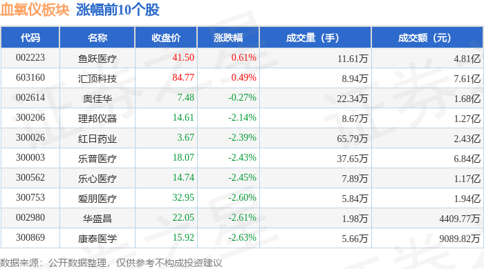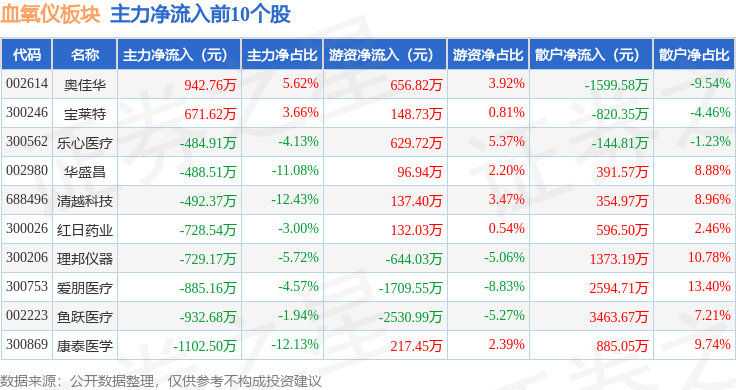 从资金流向上来看,当日血氧仪板块主力资金净流出3.08亿元,游资资金净流出198.08万元,散户资金净流入3.1亿元。血氧仪板块个股资金流向见下表: