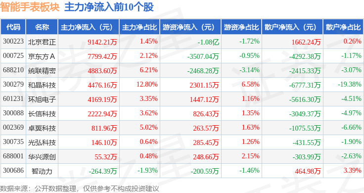 从资金流向上来看,当日智能手表板块主力资金净流出31.45亿元,游资资金净流入7.64亿元,散户资金净流入23.81亿元。智能手表板块个股资金流向见下表: