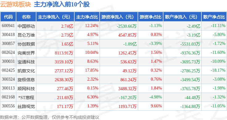 从资金流向上来看,当日云游戏板块主力资金净流出28.73亿元,游资资金净流入6.47亿元,散户资金净流入22.26亿元。云游戏板块个股资金流向见下表: