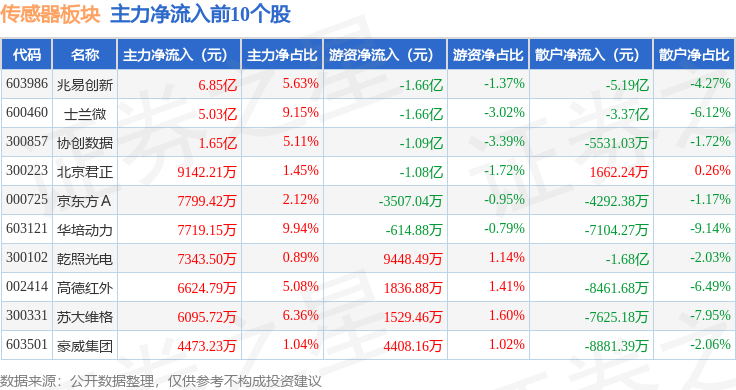 从资金流向上来看,当日传感器板块主力资金净流出41.12亿元,游资资金净流入6.8亿元,散户资金净流入34.32亿元。传感器板块个股资金流向见下表: