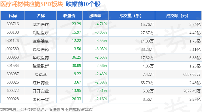 证券之星消息,1月28日医疗耗材供应链SPD板块较上一交易日下跌1.82%,塞力医疗领跌。当日上证指数报收于4151.24,上涨0.27%。深证成指报收于14342.9,上涨0.09%。医疗耗材供应链SPD板块个股涨跌见下表: