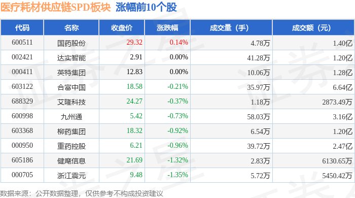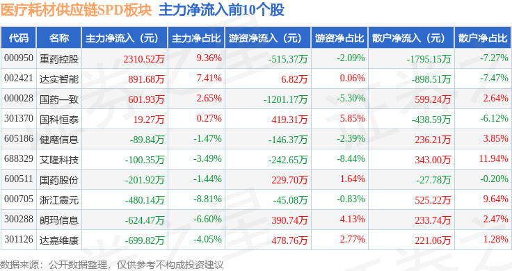 从资金流向上来看,当日医疗耗材供应链SPD板块主力资金净流出3.09亿元,游资资金净流出2177.0万元,散户资金净流入3.31亿元。医疗耗材供应链SPD板块个股资金流向见下表: