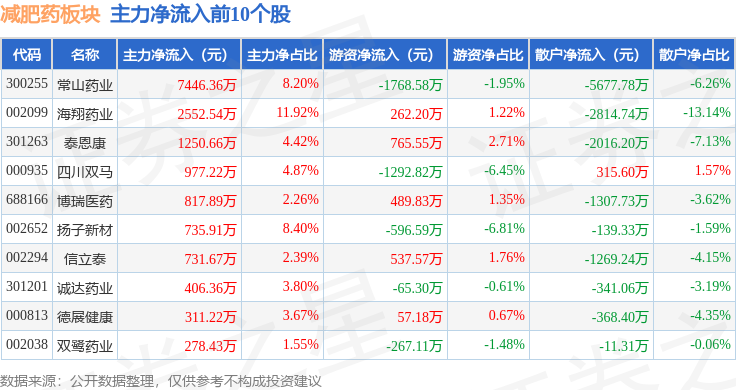 从资金流向上来看,当日减肥药板块主力资金净流出15.16亿元,游资资金净流入1.18亿元,散户资金净流入13.98亿元。减肥药板块个股资金流向见下表: