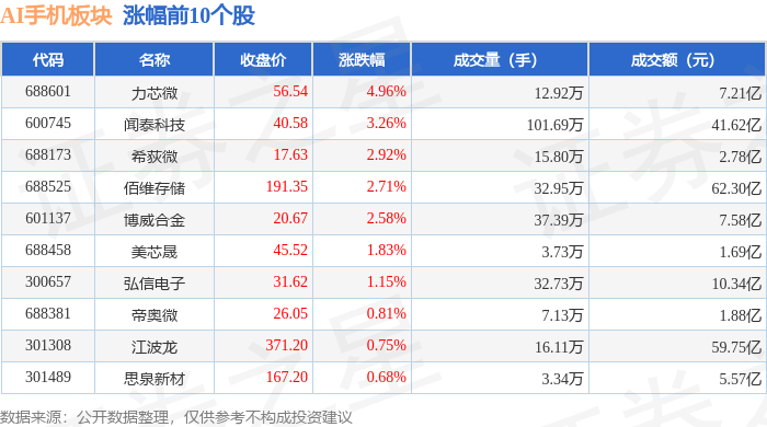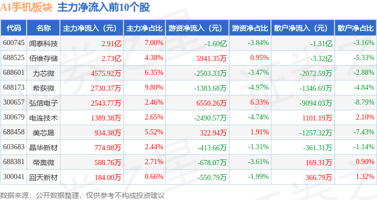 从资金流向上来看,当日AI手机板块主力资金净流出20.75亿元,游资资金净流入4.0亿元,散户资金净流入16.75亿元。AI手机板块个股资金流向见下表: