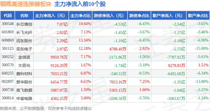 从资金流向上来看,当日铜缆高速连接器板块主力资金净流出22.99亿元,游资资金净流入5.39亿元,散户资金净流入17.61亿元。铜缆高速连接器板块个股资金流向见下表: