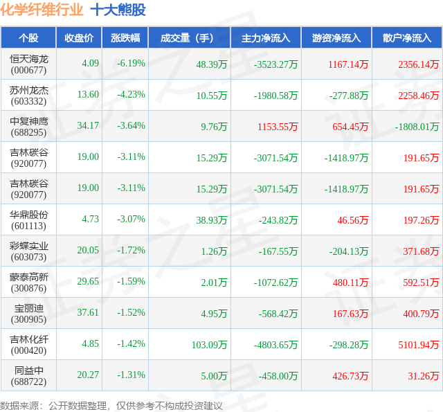 个股表现方面,化学纤维行业当日领跌股为恒天海龙(000677),该股当日报收4.09,下跌6.19%,成交量48.39万,主力资金净流出3523.27万元。苏州龙杰(603332)以下跌4.23%紧随其后,该股当日成交量10.55万,主力资金净流出1980.58万元。除此之外,中复神鹰(688295)、吉林碳谷(920077)、吉林碳谷(920077)均进入当日熊股之列。具体个股列表见下表: