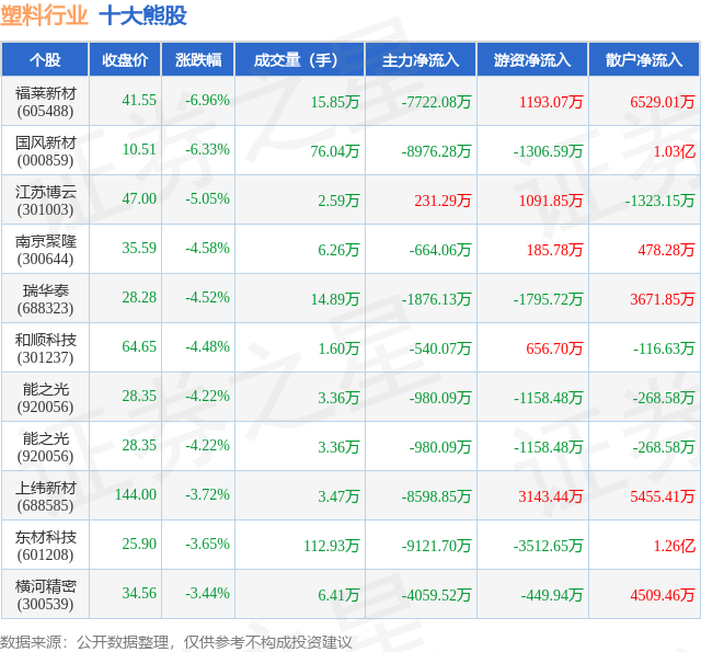 个股表现方面,塑料行业当日领跌股为福莱新材(605488),该股当日报收41.55,下跌6.96%,成交量15.85万,主力资金净流出7722.08万元。国风新材(000859)以下跌6.33%紧随其后,该股当日成交量76.04万,主力资金净流出8976.28万元。除此之外,江苏博云(301003)、南京聚隆(300644)、瑞华泰(688323)均进入当日熊股之列。具体个股列表见下表: