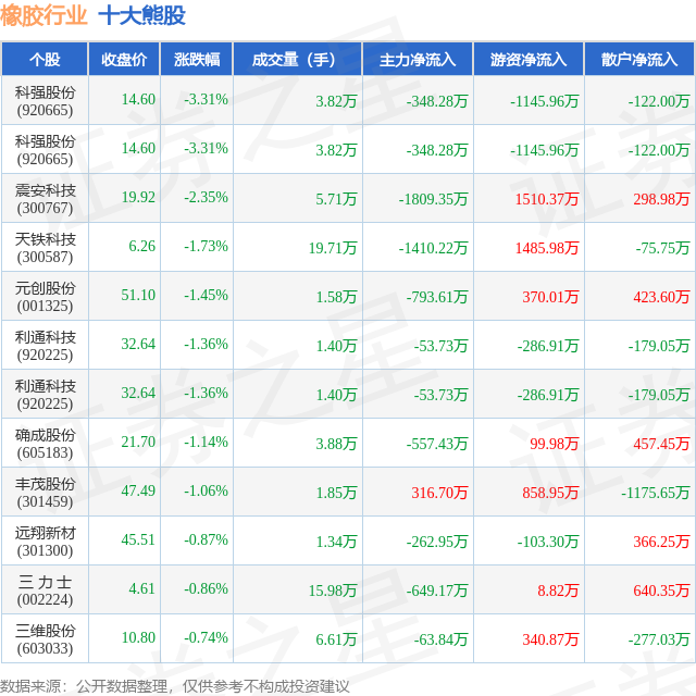 个股表现方面,橡胶行业当日领跌股为科强股份(920665),该股当日报收14.6,下跌3.31%,成交量3.82万,主力资金净流出348.28万元。科强股份(920665)以下跌3.31%紧随其后,该股当日成交量3.82万,主力资金净流出348.28万元。除此之外,震安科技(300767)、天铁科技(300587)、元创股份(001325)均进入当日熊股之列。具体个股列表见下表: