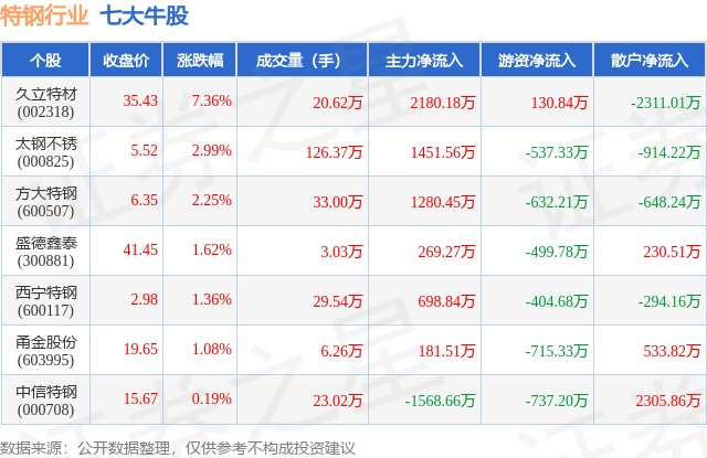 个股表现方面,特钢行业当日领涨股为久立特材(002318),该股当日报收35.43,上涨7.36%,成交量20.62万,主力资金净流入2180.18万元。太钢不锈(000825)以上涨2.99%紧随其后,该股当日成交量126.37万,主力资金净流入1451.56万元。除此之外,方大特钢(600507)、盛德鑫泰(300881)、西宁特钢(600117)均进入当日牛股之列。具体个股列表见下表:
