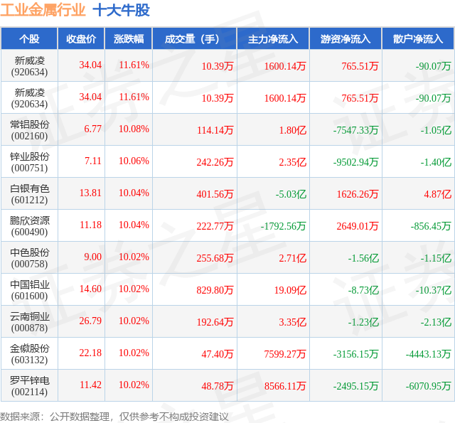 个股表现方面,工业金属行业当日领涨股为新威凌(920634),该股当日报收34.04,上涨11.61%,成交量10.39万,主力资金净流入1600.14万元。新威凌(920634)以上涨11.61%紧随其后,该股当日成交量10.39万,主力资金净流入1600.14万元。除此之外,常铝股份(002160)、锌业股份(000751)、白银有色(601212)均进入当日牛股之列。具体个股列表见下表: