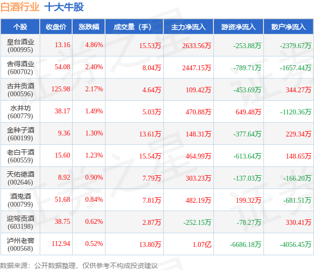 个股表现方面,白酒行业当日领涨股为皇台酒业(000995),该股当日报收13.16,上涨4.86%,成交量15.53万,主力资金净流入2633.56万元。舍得酒业(600702)以上涨2.4%紧随其后,该股当日成交量8.04万,主力资金净流入2447.15万元。除此之外,古井贡酒(000596)、水井坊(600779)、金种子酒(600199)均进入当日牛股之列。具体个股列表见下表: