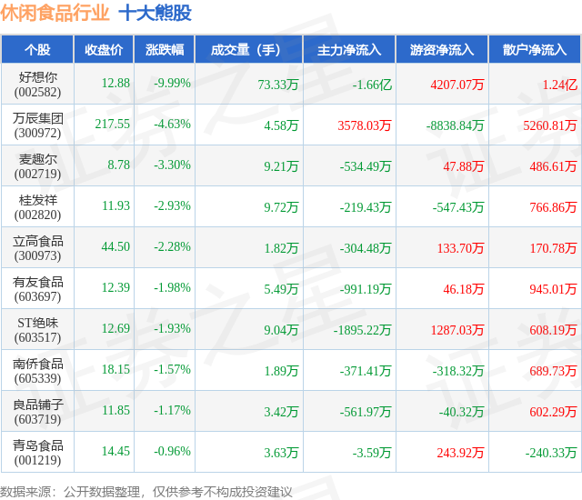 个股表现方面,休闲食品行业当日领跌股为好想你(002582),该股当日报收12.88,下跌9.99%,成交量73.33万,主力资金净流出1.66亿元。万辰集团(300972)以下跌4.63%紧随其后,该股当日成交量4.58万,主力资金净流入3578.03万元。除此之外,麦趣尔(002719)、桂发祥(002820)、立高食品(300973)均进入当日熊股之列。具体个股列表见下表: