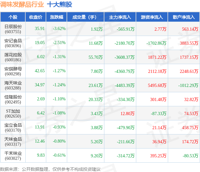 个股表现方面,调味发酵品行业当日领跌股为日辰股份(603755),该股当日报收35.91,下跌3.62%,成交量1.92万,主力资金净流出565.91万元。安记食品(603696)以下跌2.51%紧随其后,该股当日成交量11.68万,主力资金净流出2180.7万元。除此之外,莲花控股(600186)、安琪酵母(600298)、海天味业(603288)均进入当日熊股之列。具体个股列表见下表: