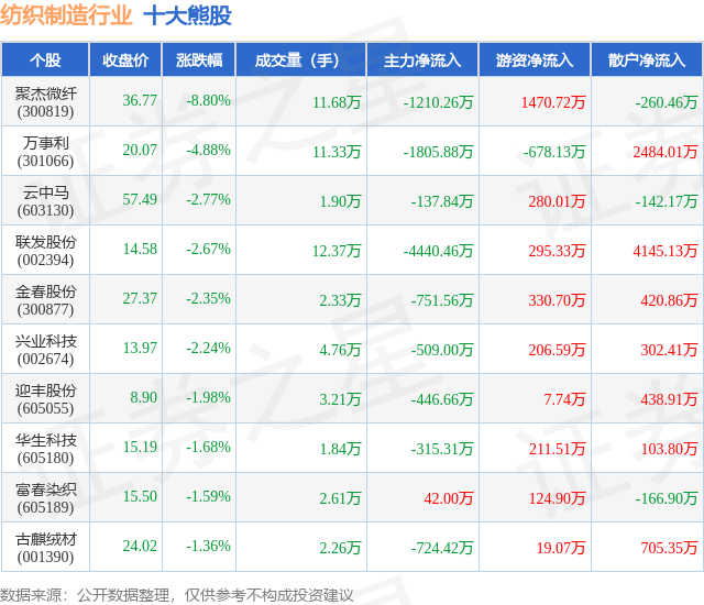 个股表现方面,纺织制造行业当日领跌股为聚杰微纤(300819),该股当日报收36.77,下跌8.8%,成交量11.68万,主力资金净流出1210.26万元。万事利(301066)以下跌4.88%紧随其后,该股当日成交量11.33万,主力资金净流出1805.88万元。除此之外,云中马(603130)、联发股份(002394)、金春股份(300877)均进入当日熊股之列。具体个股列表见下表: