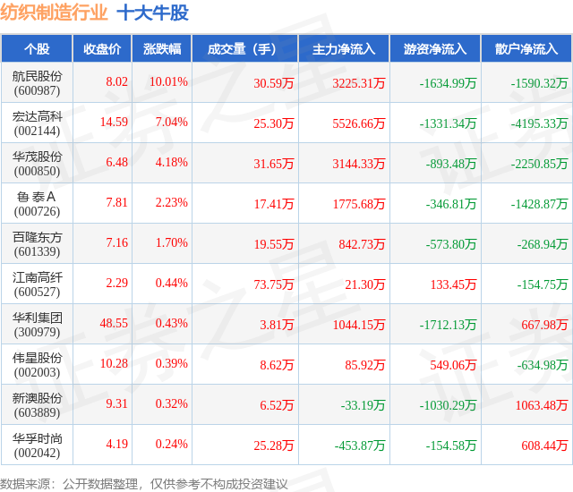 个股表现方面,纺织制造行业当日领涨股为航民股份(600987),该股当日报收8.02,上涨10.01%,成交量30.59万,主力资金净流入3225.31万元。宏达高科(002144)以上涨7.04%紧随其后,该股当日成交量25.3万,主力资金净流入5526.66万元。除此之外,华茂股份(000850)、鲁 泰A(000726)、百隆东方(601339)均进入当日牛股之列。具体个股列表见下表: