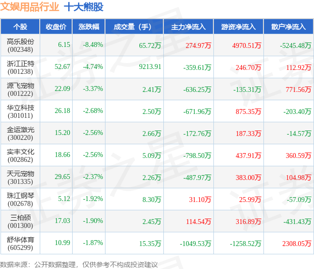 个股表现方面,文娱用品行业当日领跌股为高乐股份(002348),该股当日报收6.15,下跌8.48%,成交量65.72万,主力资金净流入274.97万元。浙江正特(001238)以下跌4.74%紧随其后,该股当日成交量9214.0,主力资金净流出359.61万元。除此之外,源飞宠物(001222)、华立科技(301011)、金运激光(300220)均进入当日熊股之列。具体个股列表见下表: