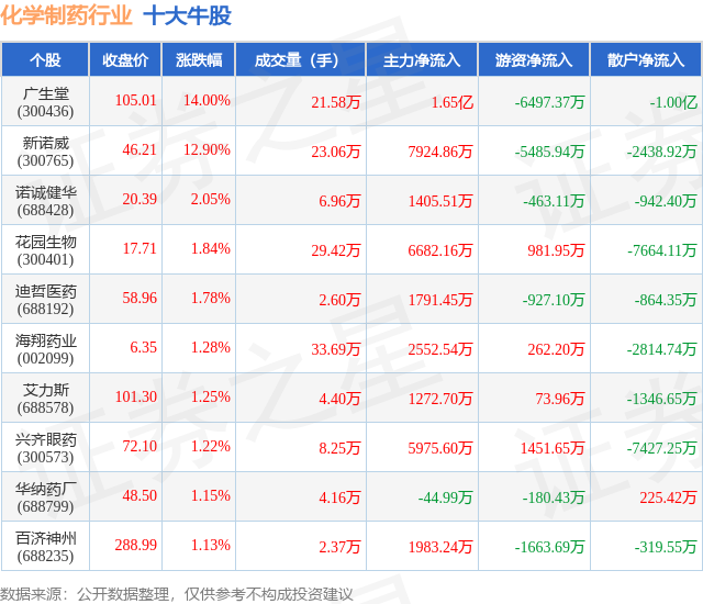 个股表现方面,化学制药行业当日领涨股为广生堂(300436),该股当日报收105.01,上涨14.0%,成交量21.58万,主力资金净流入1.65亿元。新诺威(300765)以上涨12.9%紧随其后,该股当日成交量23.06万,主力资金净流入7924.86万元。除此之外,诺诚健华(688428)、花园生物(300401)、迪哲医药(688192)均进入当日牛股之列。具体个股列表见下表:
