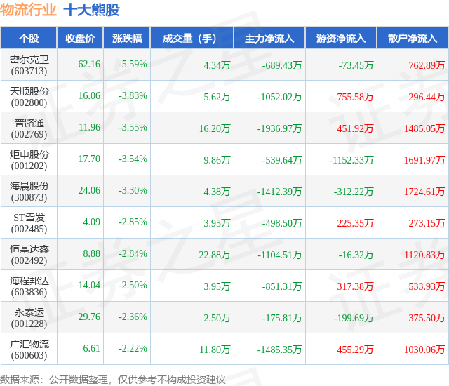 个股表现方面,物流行业当日领跌股为密尔克卫(603713),该股当日报收62.16,下跌5.59%,成交量4.34万,主力资金净流出689.43万元。天顺股份(002800)以下跌3.83%紧随其后,该股当日成交量5.62万,主力资金净流出1052.02万元。除此之外,普路通(002769)、炬申股份(001202)、海晨股份(300873)均进入当日熊股之列。具体个股列表见下表: