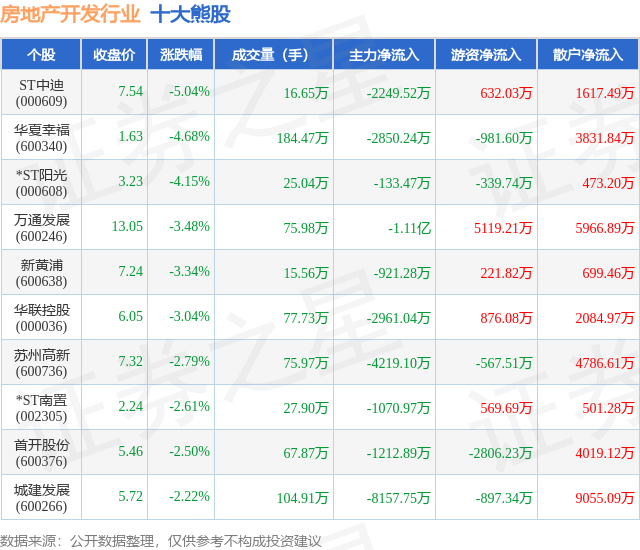 个股表现方面,房地产开发行业当日领跌股为ST中迪(000609),该股当日报收7.54,下跌5.04%,成交量16.65万,主力资金净流出2249.52万元。华夏幸福(600340)以下跌4.68%紧随其后,该股当日成交量184.47万,主力资金净流出2850.24万元。除此之外,*ST阳光(000608)、万通发展(600246)、新黄浦(600638)均进入当日熊股之列。具体个股列表见下表: