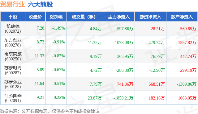 个股表现方面,贸易行业当日领跌股为凯瑞德(002072),该股当日报收7.28,下跌1.49%,成交量4.84万,主力资金净流出597.86万元。东方创业(600278)以下跌0.91%紧随其后,该股当日成交量11.35万,主力资金净流出1078.08万元。除此之外,南京商旅(600250)、苏豪时尚(600287)、苏豪弘业(600128)均进入当日熊股之列。具体个股列表见下表: