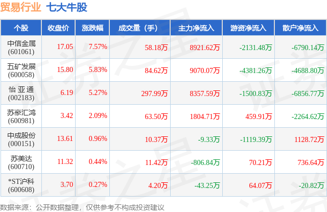 个股表现方面,贸易行业当日领涨股为中信金属(601061),该股当日报收17.05,上涨7.57%,成交量58.18万,主力资金净流入8921.62万元。五矿发展(600058)以上涨5.83%紧随其后,该股当日成交量84.62万,主力资金净流入9070.07万元。除此之外,怡 亚 通(002183)、苏豪汇鸿(600981)、中成股份(000151)均进入当日牛股之列。具体个股列表见下表:
