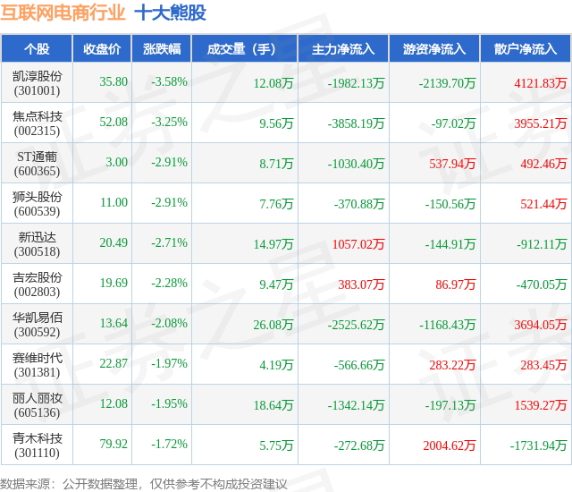 个股表现方面,互联网电商行业当日领跌股为凯淳股份(301001),该股当日报收35.8,下跌3.58%,成交量12.08万,主力资金净流出1982.13万元。焦点科技(002315)以下跌3.25%紧随其后,该股当日成交量9.56万,主力资金净流出3858.19万元。除此之外,ST通葡(600365)、狮头股份(600539)、新迅达(300518)均进入当日熊股之列。具体个股列表见下表: