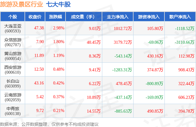 个股表现方面,旅游及景区行业当日领涨股为大连圣亚(600593),该股当日报收47.38,上涨2.98%,成交量9.03万,主力资金净流入1012.72万元。众信旅游(002707)以上涨1.8%紧随其后,该股当日成交量40.45万,主力资金净流入3179.72万元。除此之外,黄山旅游(600054)、西安旅游(000610)、长白山(603099)均进入当日牛股之列。具体个股列表见下表: