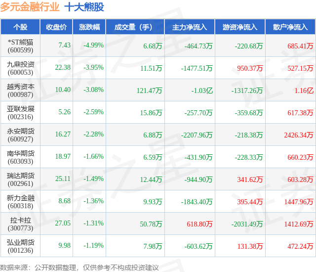 个股表现方面,多元金融行业当日领跌股为*ST熊猫(600599),该股当日报收7.43,下跌4.99%,成交量6.68万,主力资金净流出464.73万元。九鼎投资(600053)以下跌3.95%紧随其后,该股当日成交量11.51万,主力资金净流出1477.51万元。除此之外,越秀资本(000987)、亚联发展(002316)、永安期货(600927)均进入当日熊股之列。具体个股列表见下表: