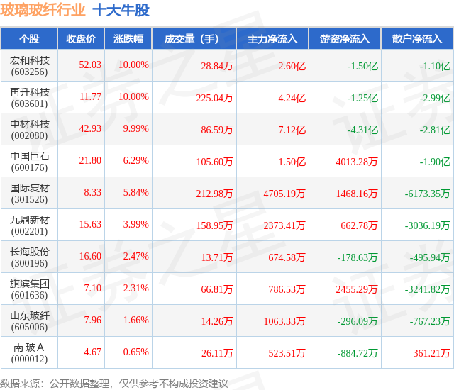 个股表现方面,玻璃玻纤行业当日领涨股为宏和科技(603256),该股当日报收52.03,上涨10.0%,成交量28.84万,主力资金净流入2.6亿元。再升科技(603601)以上涨10.0%紧随其后,该股当日成交量225.04万,主力资金净流入4.24亿元。除此之外,中材科技(002080)、中国巨石(600176)、国际复材(301526)均进入当日牛股之列。具体个股列表见下表:
