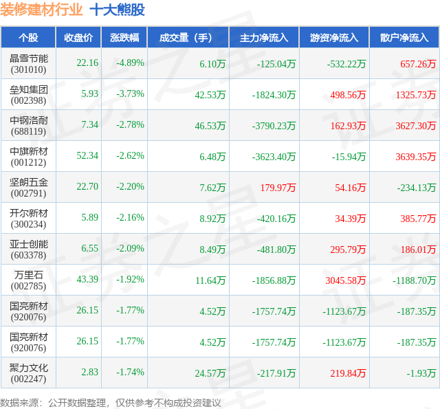 个股表现方面,装修建材行业当日领跌股为晶雪节能(301010),该股当日报收22.16,下跌4.89%,成交量6.1万,主力资金净流出125.04万元。垒知集团(002398)以下跌3.73%紧随其后,该股当日成交量42.53万,主力资金净流出1824.3万元。除此之外,中钢洛耐(688119)、中旗新材(001212)、坚朗五金(002791)均进入当日熊股之列。具体个股列表见下表: