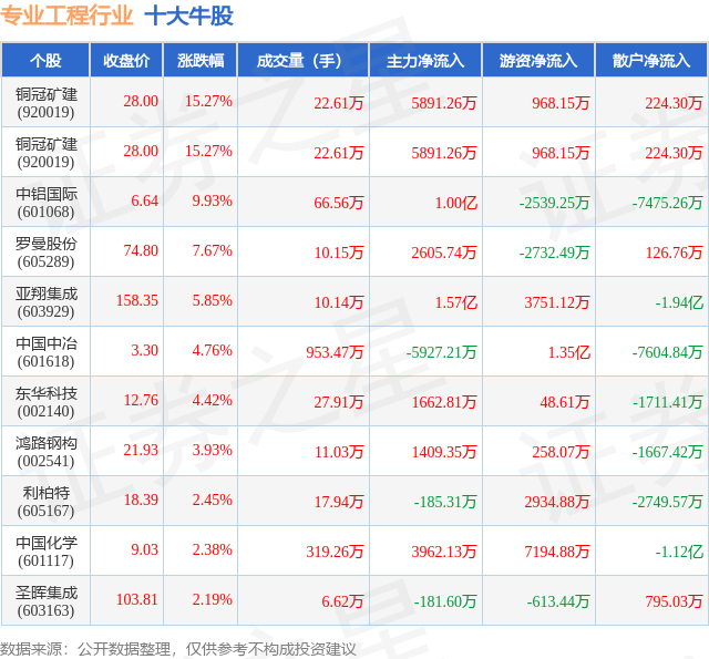 个股表现方面,专业工程行业当日领涨股为铜冠矿建(920019),该股当日报收28.0,上涨15.27%,成交量22.61万,主力资金净流入5891.26万元。铜冠矿建(920019)以上涨15.27%紧随其后,该股当日成交量22.61万,主力资金净流入5891.26万元。除此之外,中铝国际(601068)、罗曼股份(605289)、亚翔集成(603929)均进入当日牛股之列。具体个股列表见下表: