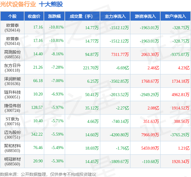 个股表现方面,光伏设备行业当日领跌股为欧普泰(920414),该股当日报收17.16,下跌10.81%,成交量14.77万,主力资金净流出1512.12万元。欧普泰(920414)以下跌10.81%紧随其后,该股当日成交量14.77万,主力资金净流出1512.12万元。除此之外,高测股份(688556)、东方日升(300118)、泽润新能(301636)均进入当日熊股之列。具体个股列表见下表: